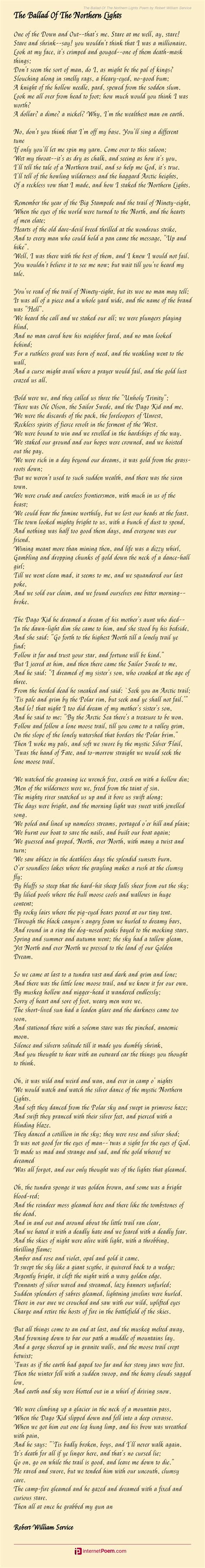 Download robert service northern lights Epub By Click Button. robert service northern lights it’s easy to recommend a new book category such as Novel, journal, comic, magazin, ect. You see it and you just know that the designer is also an author and understands the challenges involved with having a good book. You can easy klick for detailing book and you can read it online, even you can download it